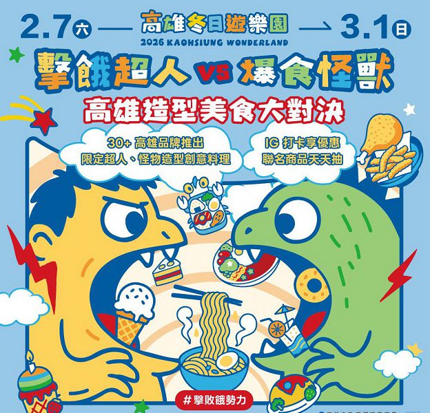 2026高雄燈會「Kaohsiung Wonderland 冬日遊樂園」2月7日至3月1日將在愛河灣盛大登場,今年與日本知名IP並邁入第60週年的「超人力霸王」合作,預期吸引海內外親子客群與跨世代粉絲造訪;為響應燈會經典角色,經發局特別企劃「擊餓超人 VS 爆食怪獸!高雄造型美食大對決」活動,串聯全市30+知名餐飲品牌,以超人、怪獸經典元素推出期間限定創意造型美食,更祭出周邊商品等大獎,邀請民眾賞燈之餘,也能透過味蕾體驗高雄美食的驚喜巧思,詳情歡迎上經發局「高雄會展網」(https://pse.is/8njc6n)經濟發展局FB與IG查詢。(圖文:記者于欽智)
