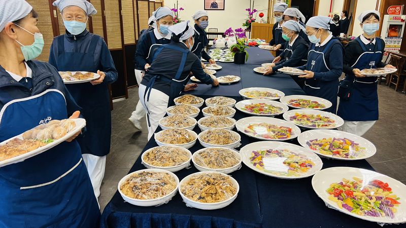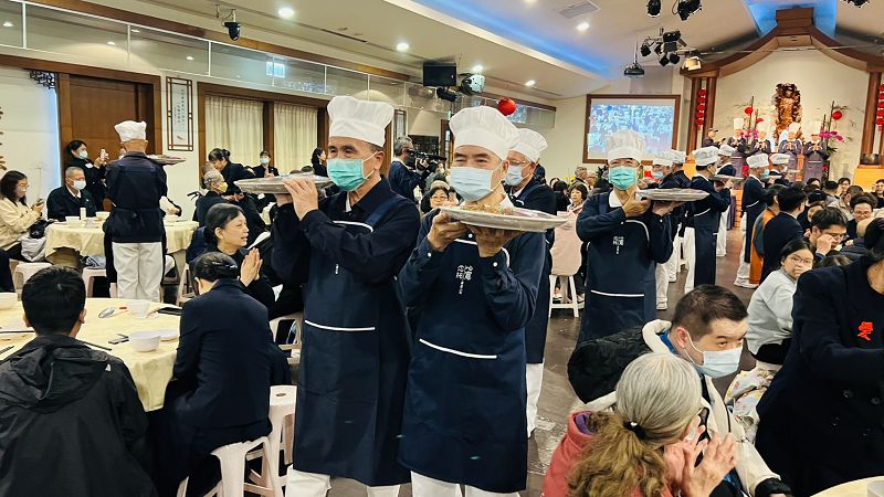 課務與活動組精心籌備,準備一袋袋豐盛物資與物資卡,讓弱勢家庭帶回家過好年。二十桌圍爐佳餚由志工熱情款待,七菜一湯搭配水果與應景發糕、蘿蔔糕,象徵十全十美,讓參與者吃得快樂飽足,也透過團聚營造暖心氛圍。
