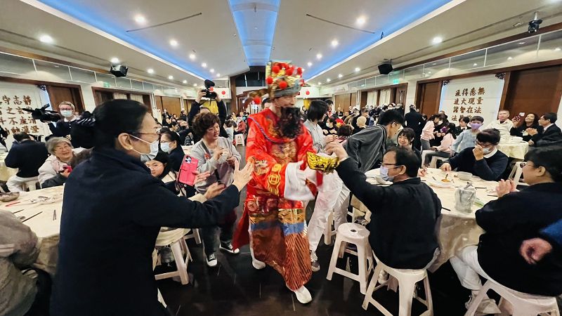 活動進入最高潮,志工巧扮財神爺送喜糖祝福,並以音樂〈The Final Countdown〉帶動上菜秀,志工端上佳餚,讓大家盡情享用,摸彩抽獎與驚喜獎更增添歡樂氛圍。就讀大學的王逸丞同學分享,參與「揚善青年」活動讓他理解慈濟理念,並鼓勵年輕人投入善行;幼教老師陳彥菁則感謝慈濟在她喪夫低谷時伸出援手,給予重建生活的勇氣,並在圍爐中感受幸福與溫暖。