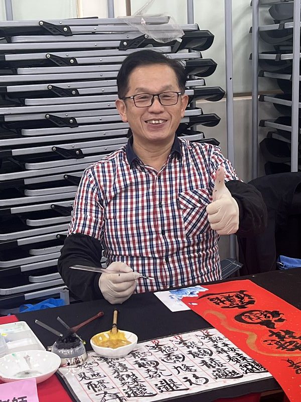 徐正泰當過基隆團管區司令、宜蘭金六結旅長,訓練新兵聞名,他親自示範操槍,退役後因書法優異,加入基隆新文藝協會,今年被推選為理事長,成員有書畫等名家,徐正泰理事長應正砂里長陳枋菱之邀,親自現場揮毫寫春聯。