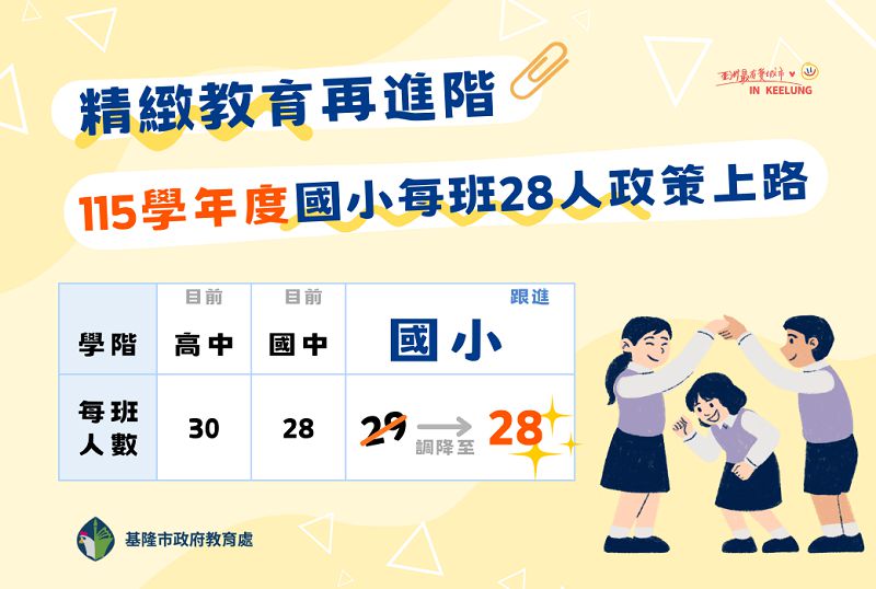 【記者張靜惠基隆報導】基市府宣布自115學年度起,全市公立國民小學每班學生人數將由現行的29人調降至28人。這項政策不僅是積極回應中央教育部「國民小學及國民中學班級編制及教職員額編制標準」的精緻教育精神,更是基隆市政府在落實教育優化上的具體行動,展現市府對教育環境品質的高度重視。