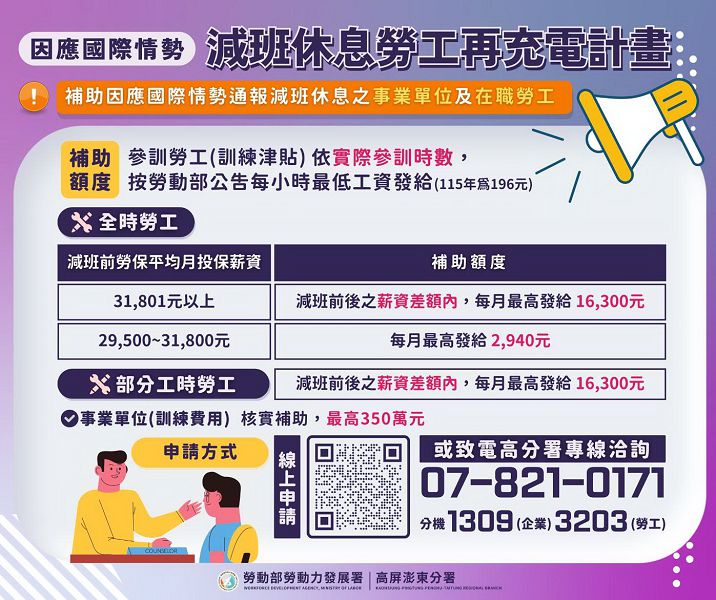 高分署郭耿華分署長表示,符合資格之勞工與事業單位可多加運用「減班休息勞工再充電計畫」資源,把握學習契機,讓減班休息成為職能成長的轉機,若想進一步瞭解申請方式及相關資訊,可至「補助企業辦理員工訓練計畫網」(https://gov.tw/r7q)線上申請,或電洽高分署諮詢專線07-8210171轉1309。