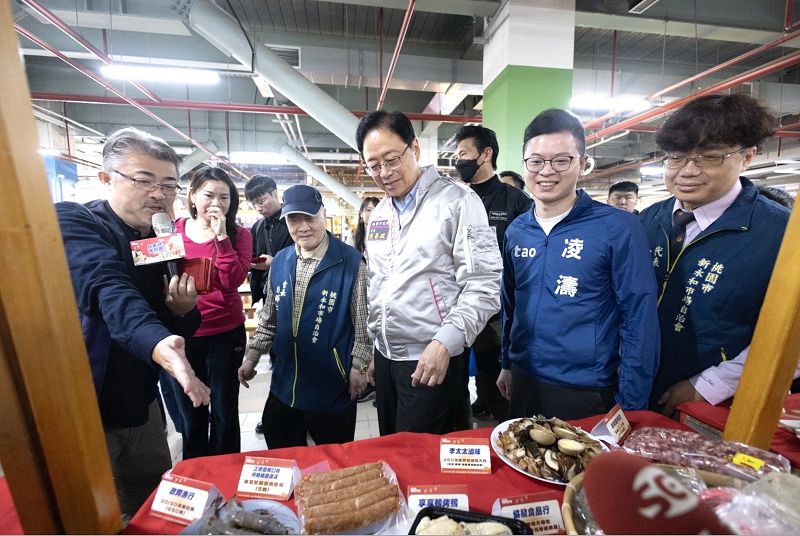 桃園市長張善政在新永和市場參觀市場,並向攤商一一問候發放桃園市府福袋。