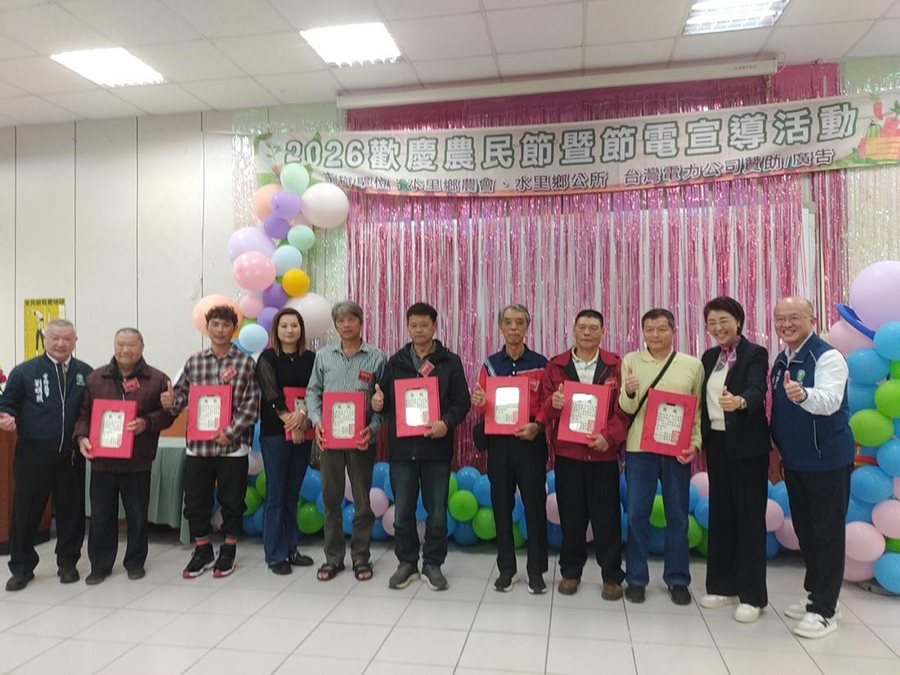 水里鄉農會2月4日在該會農民教室舉行「2026年農民節表彰大會暨節電宣導活動」,隆重表揚各界優秀農民,感謝並獎勵長期默默耕耘、辛勤付出的農友們。今年郡坑家政班榮獲「農業部114年特色家政班一人之美」殊榮,象徵其在推動社區凝聚力、生活美學及農業創新方面的卓越表現,展現水里鄉家政班的亮眼成果與典範價值。農會也將持續推動農業創新,促進地方合作與產業升級。