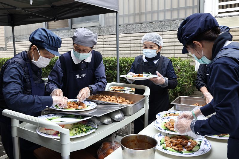 席開三十四桌,勞動十位上菜組師兄。志工蔡芳明,首次擔任上菜師兄,他說:上菜師兄穿著制服代表慈濟的人文,以前是雙手端菜地出菜,這次改以手推車出菜,感到很幸福。當一道道菜出來,讓感恩戶們食指大動,看著很歡喜,甚至最後,他們說還有?還有?我們都吃飽了!那種喜悅感到歡喜。誠如上人說的,冬令歲末祝福就是要讓大家吃飽與領個物資回去,過個好年。讓慈濟志業,慈善志業在社區深根發芽與茁壯。