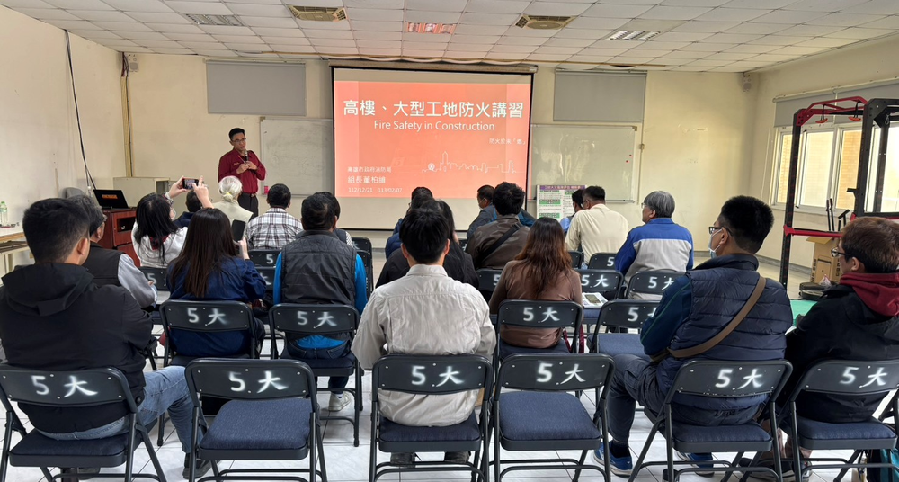 10日舉辦的施工中建築物防火座談會,由第五救災救護大隊組長董柏維主講,會中特別引用「香港宏福苑大火」國際案例,深入剖析施工中建築物因缺乏完善消防設備、消防設備因施工而關閉、防火區劃因施工破壞、現場建築易燃廢棄物堆積及抽菸、焊接施工不慎等,可能導致迅速蔓延與重大損失。