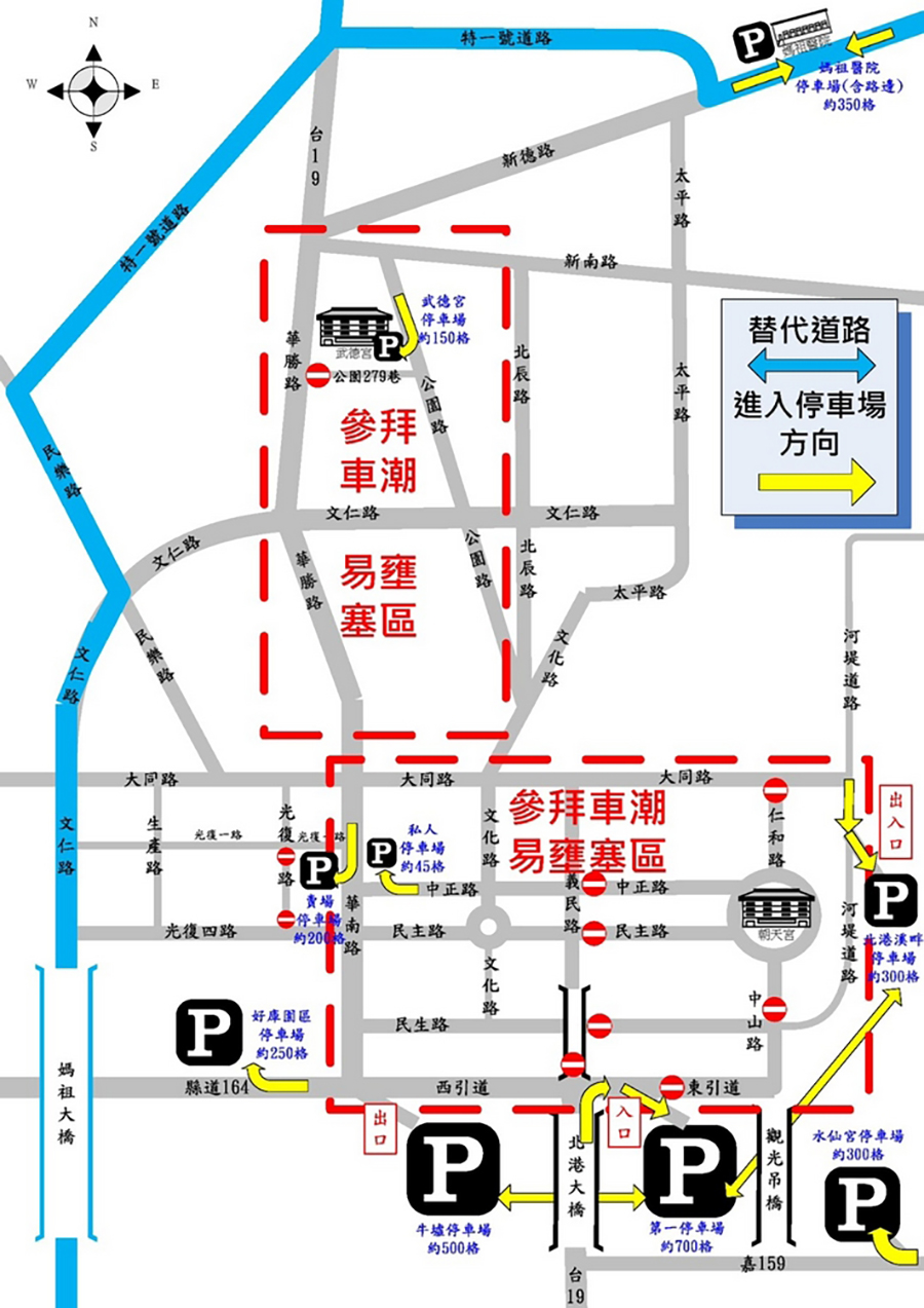 針對進出北港鎮動線,警方建議,進入市區可由國道一號民雄交流道下,接嘉義縣道164、159號道路後轉台19線或替代道路,避免行經北港大橋主線;離開北港南下車輛可由縣道159接164上國道一號,前往元長、土庫方向者,建議改走媽祖大橋接縣道145、155線,避開市區車流。