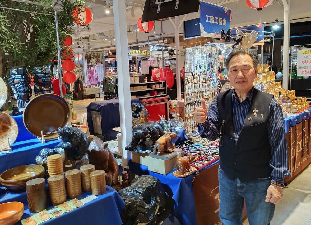 除了各式東瀛甜點與美食外,也有日本工藝精品展售,像是來自北海道的工藤工藝舍,負責人工藤昌之70多歲,除了會手作木雕外,其實也是領有執照的獵人,有多年狩獵經驗,作品題材都與大自然有關,赴台參展已20多次,對台灣不陌生,也曾販售其自製的動物標本(帶角鹿頭),很受本地客歡迎。