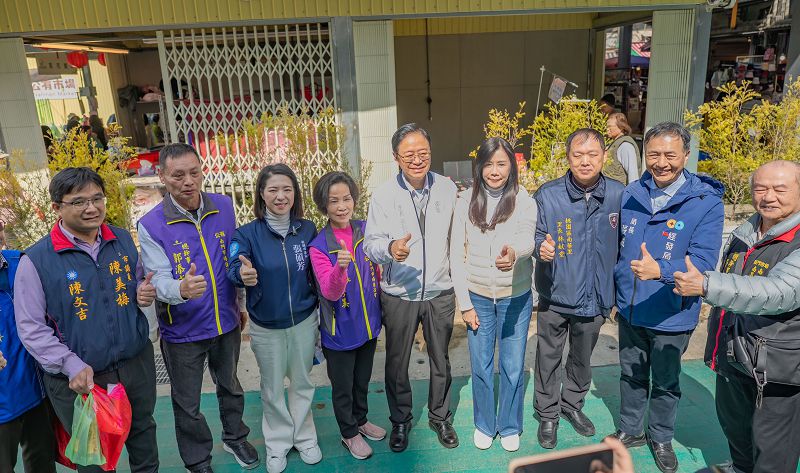 桃園市長張善政前往南門市場視察市場重新開張情形。適逢農曆春節前夕,現場採買年貨人潮踴躍,張善政沿街發送福袋,逐一向攤商及民眾拜早年,氣氛熱絡溫馨。