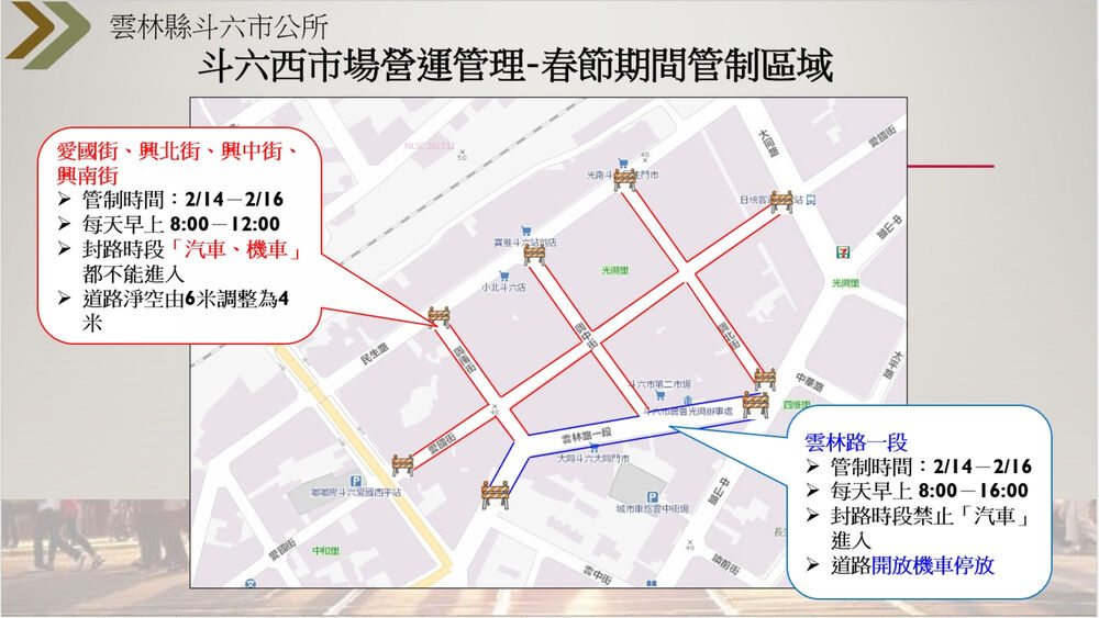 因應春節期間人潮增加,斗六市公所同步實施交通與人流管制措施如下:
