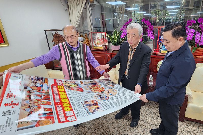 臺灣導報社長林文雄(中)展示導報精緻刊物。(記者鍾陽正攝)