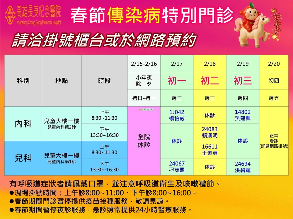 高雄長庚、大同醫院和鳳山醫院2月17日(二)至2月19日(四)均開設「春節傳染病特別門診」,提供有發燒或呼吸道症狀民眾預約就醫服務;2月20日(五)起恢復正常門診。民眾可透過高雄長庚、大同醫院、鳳山醫院官網或「長庚e指通」App查詢春節門診資訊,也可利用「健保快易通」App查詢即時急診訊息。