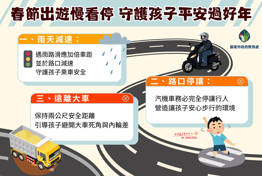 【記者張毅基隆報導】春節期間,返鄉與出遊人潮湧現。為守護學生假期安全,基隆市政府教育處特別提醒家長,假期安全不只是遵守交通規則,更是給孩子最珍貴的平安保障。根據交通部統計,路口是事故發生率最高的地點,教育處呼籲家長與學童共同實踐「車輛慢看停、行人安全行」,讓安全成為春節出遊的首要準則。