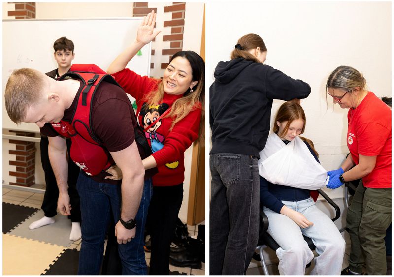 圖說右:年輕志工們選擇在周六上午學習急救,這安靜而有力地提醒我們,同情心、責任感和助人為樂的意願可以從任何年齡開始培養。(攝影:Igor Prys) 圖說左:在急救訓練中,陳亮妤與丈夫巴爾托什・拉伊特(Bartosz Rajter)一同練習處理窒息與復原體位,將課堂所學化為實際操作。(攝影:Igor Prys)