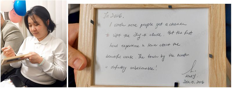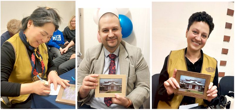 台灣籍志工鄧姮琦、波蘭籍志工皮奧特·馬拉卡(Piotr Malak)與烏克蘭籍志工維多利亞·桑奇基夫斯卡(Viktoriia Sanchkivska)在靜思精舍照片背後寫下 2026 年心願,期待有天能親自回到花蓮拜訪靜思精舍,讓心回到慈善的源頭。(攝影: 張淑兒)