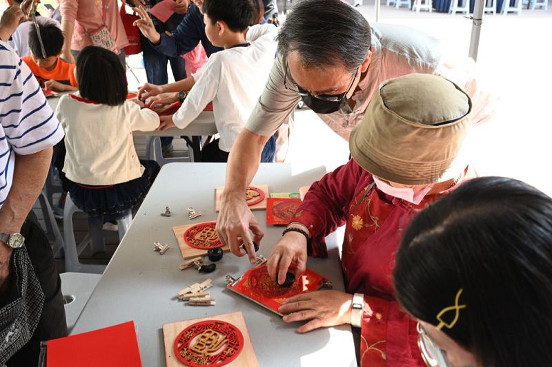 靜思堂內設置多項闖關體驗:祈福牆、拓印幸福、肌力平衡訓練、靜思花道、擂茶、紅包紙燈籠、打包帶做柿子等,吸引大小朋友參與。教練李璟蕓示範如何利用保特瓶進行肌力訓練,提醒三十歲後肌力逐年下降,需及早保養。書法老師夏士清則推出「蠟墨拓印」體驗,讓民眾在創作中感受節慶意涵。