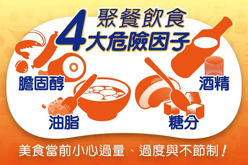 許景盛指出,聚餐飲食潛藏四大危險因子:膽固醇、油脂、糖分與酒精。尤其春節常見的燉補湯、醃製肉、帶殼海鮮與各式糕點,會大幅增加消化系統負擔,使膽囊劇烈收縮,容易導致膽汁淤積形成結石,進而阻塞膽胰管,引發膽囊與胰臟發炎。再加上勸酒、乾杯氣氛助長,不知不覺攝取過量酒精,達到「危險性飲酒」程度,平時不喝酒的人突然大量飲酒,會成為高風險族群!酒精會直接傷害胰臟,無法順利排出消化液,若再搭配高油脂飲食刺激分泌,容易引發胰臟消化液自我消融,造成劇烈腹痛。嚴重的甚至可能引發全身發炎反應,導致多重器官衰竭、休克,危及生命。