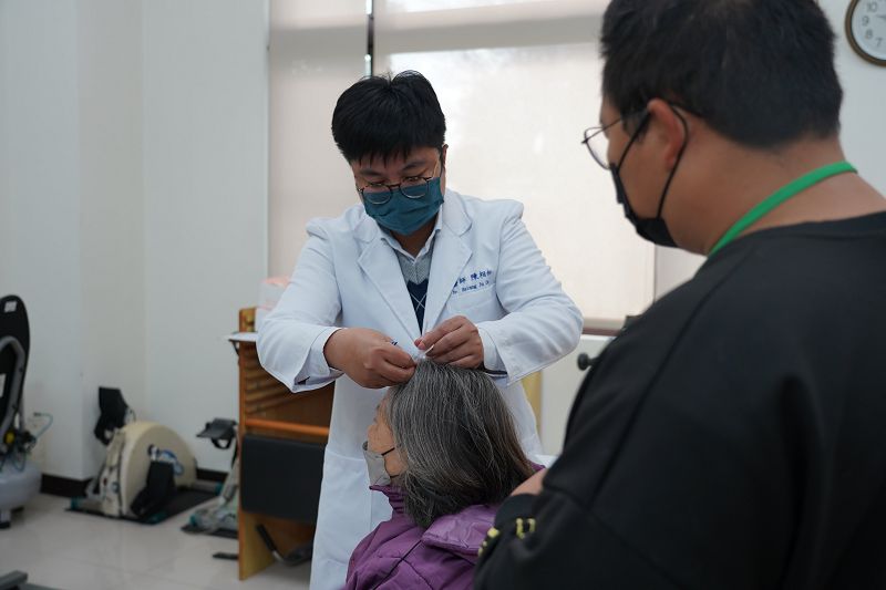 中醫部醫師陳相如(左)為傷友針灸治療,透過中西醫合療模式,協助傷友放鬆肌肉張力並緩解神經疼痛。