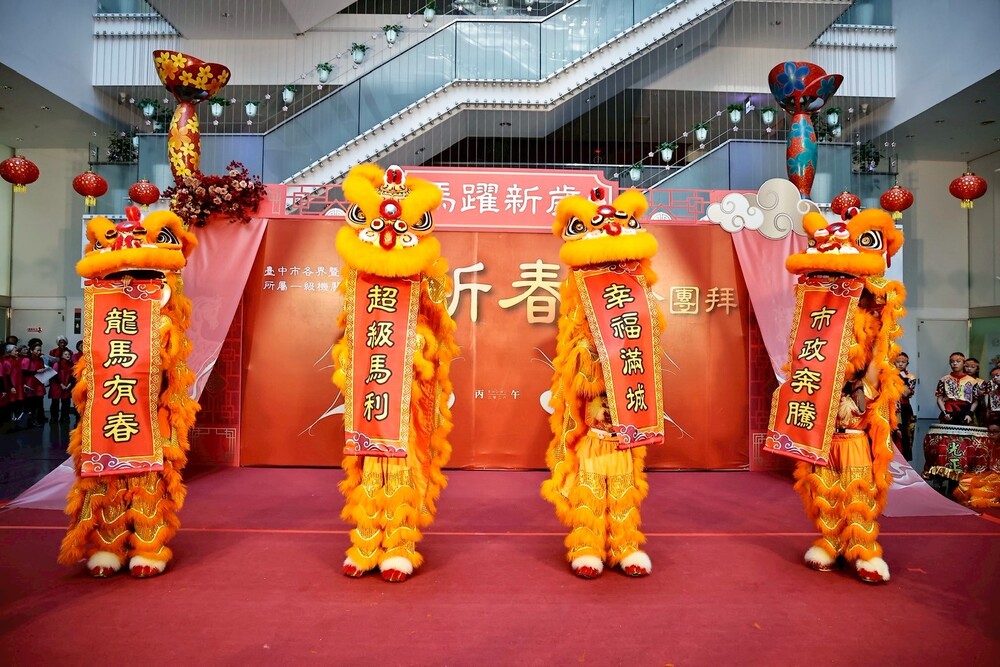 在「敲好運(超好運)」的鑼聲中,黃副市長帶領市府團隊象徵好運開啟,帶領台中朝向宜居、宜業、宜遊的國際化幸福城市邁進。現場上千位各界人士及同仁共襄盛舉,中市府公務人員協會、現職暨退休公教合唱團以及活潑可愛的小獅團皆帶來精彩演出,洋溢濃厚年節氛圍。