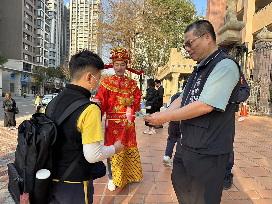 圖說:中市警四分局轄內國小在廿三日同步開學,警方全面啟動「護童專案」勤務,在各校門口及重要路口編排警力,維護學童通行安全;分局長蔡慶星一早特地前往永春國小關心護童勤務執行情形,在校門口迎接學童到校,同時與師長寒暄交流,了解開學首日狀況;不免俗地,蔡慶星以簡單易懂方式向小朋友宣導犯罪預防觀念,同時友分發文具宣導品,提醒小朋友上學途中注意安全外,並使犯罪預防宣導教育向下扎根。(記者許順德翻攝)