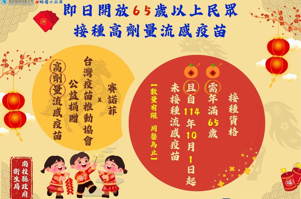 陳局長呼籲民眾,目前國內 B 型流感佔比有增加趨勢,且流感病毒傳播速度快,可能引發肺炎或心肌炎等併發症。接種疫苗是預防流感及降低重症最有效的方法。為提升高齡族群防護力,台灣疫苗推動協會捐贈「菲優達高劑量三價流感疫苗」予本縣使用,即日起開放社區 65 歲以上長者(且於 114 年 10 月 1 日以後尚未接種流感疫苗者)免費接種,高劑量流感疫苗與一般公費流感疫苗不同,屬於自費疫苗,該疫苗所含抗原量為一般流感疫苗的 4 倍,能誘發更強免疫反應,對於免疫功能較弱的高齡族群具明顯助益。由於此類疫苗每劑市價約新臺幣 2,000 元,資源極其珍貴且數量有限,建議民眾接種疫苗前,先洽詢各鄉鎮市衛生所及合約醫療院所,相關防疫資訊請洽縣府衛生局網站(傳染病防治專區)查詢,網址:http://www.ntshb.gov.tw,或撥打衛生局專線2220904洽詢。另本縣各衛生所及合約院所亦持續提供一般公費流感疫苗服務,請符合資格民眾踴躍前往接種。