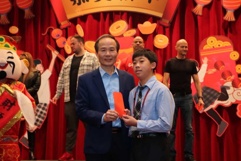 新興國際中小學每年過年後開學都會發給學生外幣紅包,每個人拿到的都是不同國家的外幣,今年發放的外幣計有馬來幣、新加坡幣、澳幣、歐元、泰銖、美金、日幣、韓幣等八種。現場還有外師扮演的財神爺與新興吉祥寶寶一起祝賀新年。同學拿著紅包,臉上充滿幸福的笑容,現場洋溢新春的喜悅與溫馨和諧氣氛。