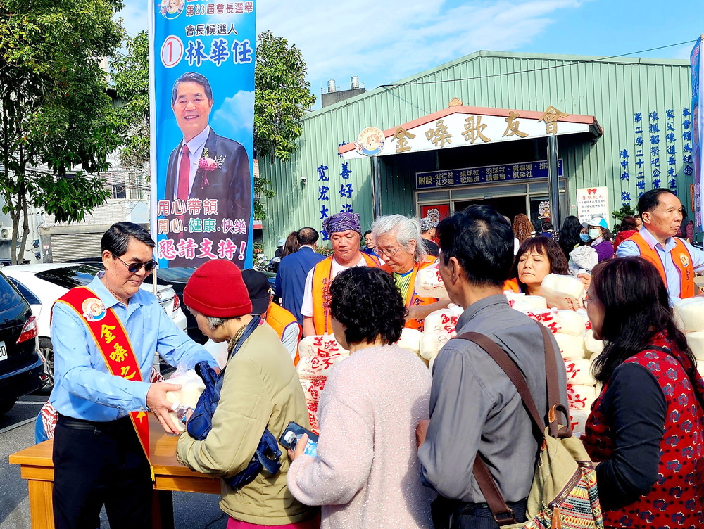 【記者鍾陽正桃園報導】桃園市金嗓歌友協會第23屆會長林華任罹患攝護腺癌第四期現化療中,為感謝會友們的集氣祈福與關愛,發心願在年終做愛心活動,活絡年節氛圍表達謝意,特於農曆小年夜在金嗓歌友會前廣場發送3600顆饅頭給會員及里鄰弱勢者,讓500人受惠,現場大排長龍依序提領,處處充滿歡樂氣氛,相當熱鬧。林華任表示,這只個開端,將來會持續投身公益,推動救濟活動來嘉惠鄉里。金嗓歌友會館長陳中央、輔導會長郭建宏及多位歷任會長均共襄盛舉。