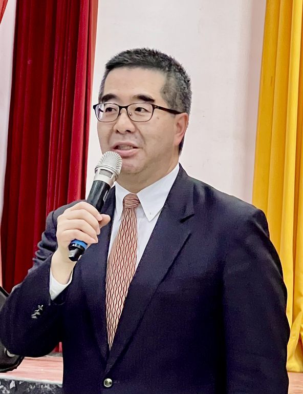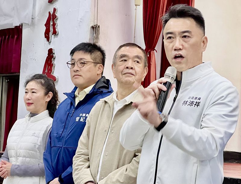 基隆前市長張通榮等來賓一起大合照,由於基隆市藍白合有良好成效,但選舉輕忽不得,林沛祥在國會奮鬥的經驗和感受,籲請大家馬年大團結。大門內,貼了春聯,韓國瑜的「馬上幸福」、謝國樑的「馬來迎吉」、林沛祥的「馬來迎祥」、鄭麗文的「幸福加馬」,加上台北市長蔣萬安的「今馬熊讚」名書法家張炳煌為基隆寫的「馬躍鷹翔」,祝馬年行大運「國泰民安」!