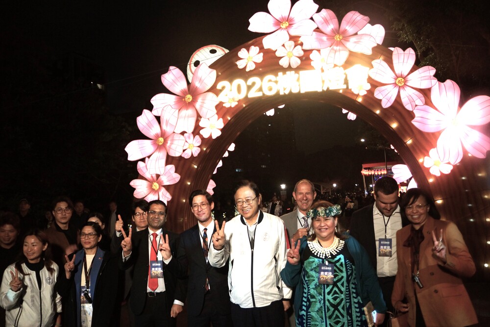 【記者徐玉英桃園報導】桃園市長張善政25日晚間在市議員黃婉如、林政賢、陳美梅、孫韻璇、李光達、李宗豪、黃瓊慧、市府觀旅局長陳靜芳、文化局長邱正生、農業局長陳冠義、交通局長張新福、客家局長范姜泰基、社會局長陳寶民、青年局長侯佳齡、婦幼局長杜慈容、警察局長廖恆裕、體育局長許彥輝、環保局長顏己喨、消防局長龔永信、民政局副局長藍品畯、桃園區長許敏松、龜山區長張嘉平、桃園市觀光發展基金會副執行長陳信守、馬紹爾群島共和國大使卡蒂爾(Anjanette Kattil)、海地共和國大使館大使潘恩、貝里斯大使館大使梅凱瑟、歐洲經貿辦事處長谷力哲、印度台北協會長德寧瀚、駐台北韓國代表部代理代表高尚郁、瑞典貿易暨投資委員會台北辦事處副代表韓柏翰、匈牙利貿易辦事處副代表周題、馬尼拉經濟文化辦事處行政與財務主任Ma. Karina Bercasio Perida-Trayvilla、北烏蘭巴托貿易經濟代表處官員曹雅芝、宮廟燈區宮廟代表等人陪同下,前往桃園區虎頭山創新園區出席「2026桃園燈會-飛馬耀桃園」開燈儀式。