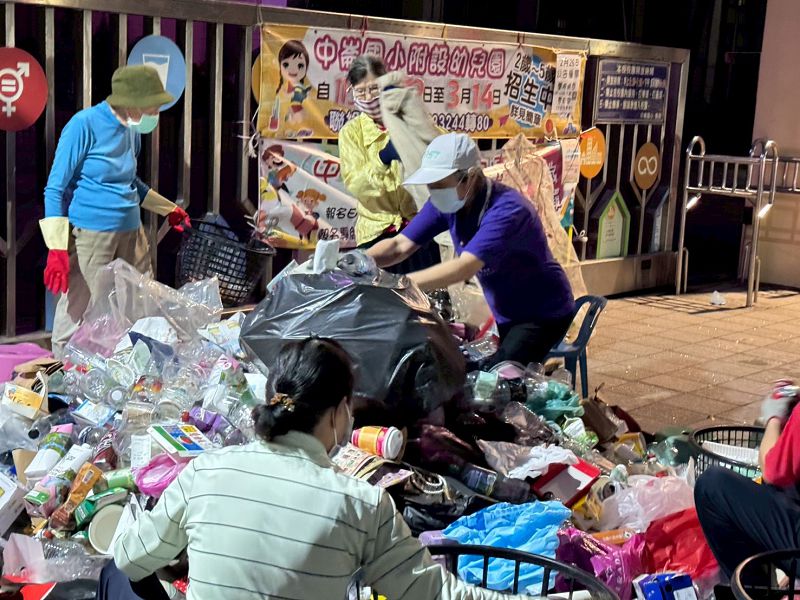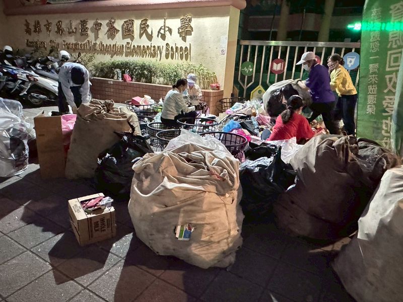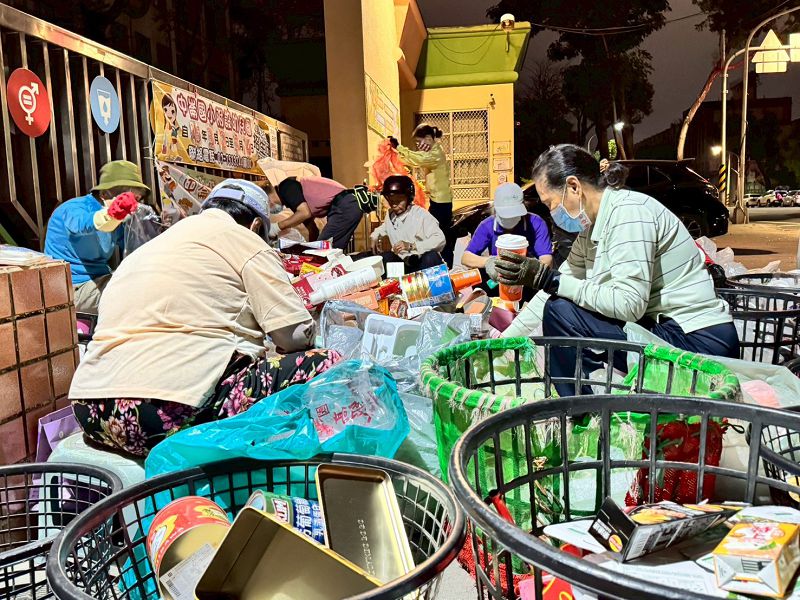 傍晚至夜晚,志工們依舊忙碌。紙箱綑綁整齊,回收物排列有序,等待環保車載回環保站。夜色中,燈光映照著大家的身影,沒有喧嘩,卻充滿靜靜流動的溫度。這樣的畫面,每週都在中崙社區上演。一群人,用雙手守護大地;一群人,把善的種子,慢慢種進社區。