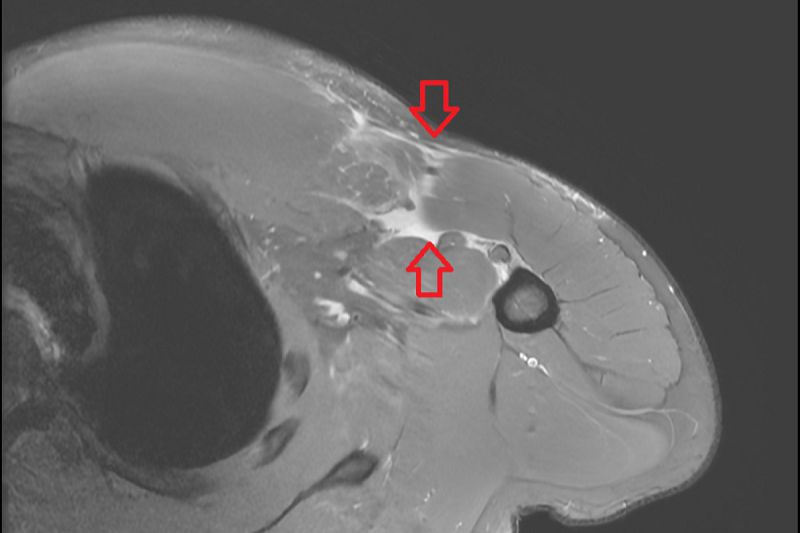 27歲的林先生平時有規律的健身習慣,某次在健身房進行臥推訓練,在休息時放下槓鈴的瞬間,突然感到右側胸口劇烈疼痛,右上肢越發無力,伴隨瘀青腫脹,遂至台北慈濟醫院骨科門診求診。李奕澄醫師藉由理學檢查與核磁共振影像,診斷為右側胸大肌斷裂,隨即安排胸大肌肌腱縫合手術,固定斷裂肌腱。術後林先生按時復健,力量逐步回升,半年後也恢復日常生活。