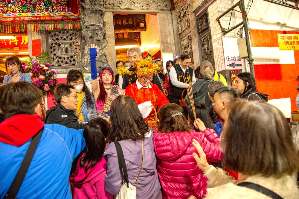壽山巖觀音寺董事長林明義扮財神爺發送糖果給現場民眾。