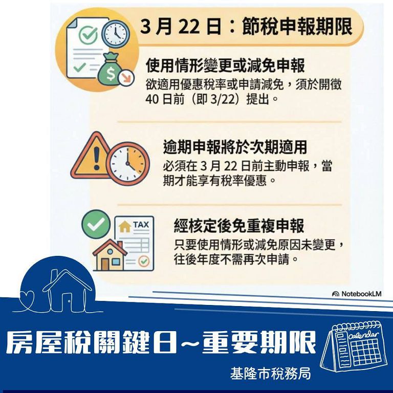 稅務局指出,納稅義務人全國持有的房屋,在每年開徵前會進行全國歸戶,如老舊房屋已燬損、坍塌或是拆除達到不堪居住的程度,而納稅義務人未在3月22日以前申報,則超過3戶的部分將會收到稅單,為減少納稅義務人事後辦理更正、退稅的困擾,請儘快在每年3月22日以前,向房屋所在地稅捐稽徵機關申報擇定,申報擇定後若後續年度持有情形未有改變依然適用;若未申報擇定,則由電腦排序免除房屋稅稅額最高的3戶,其餘稅額較低的戶數將會寄發稅單。