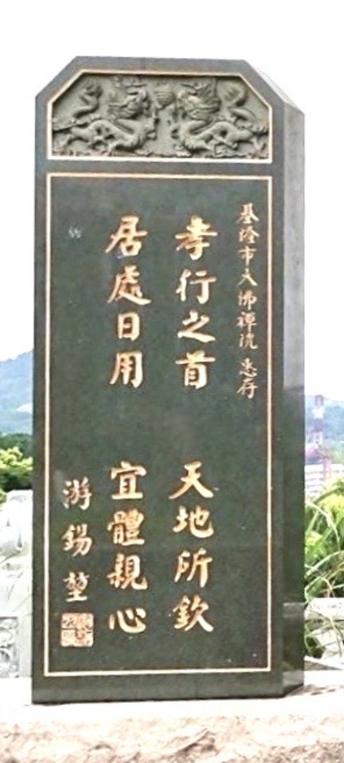 黃文榮董事長更在好友支持下,邀請當時和基隆有關的名人,將題字揮毫,請名師雕刻在石碑上,總共十面,安置在大佛院入門前廣場。基隆籍的謝修平、黃澤青、張通榮和我應邀,還有中央的首長游錫堃、王金平等人,我特別請學弟名書法家張炳煌為我選的聯語,用行草揮毫,可留傳千古。