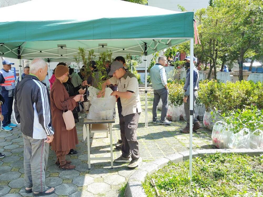 12日南投分署除透過各種闖關活動宣傳無痕山林、山林製造、生態工法、廉政守法及防止職場性騷擾等業務外,還發放顏色討喜的桃金孃及烏來杜鵑,可食用的台灣天仙果及山黃梔,花型優雅的厚葉石斑木及田代氏石斑木等6種苗木共9,000株。南投分署也利用植樹節贈苗的機會,提醒民眾整地後,挖掘容器兩倍寬度、加深20公分的植穴,依序放入有機肥料、表土,整理苗木根系,將苗木直立放入植穴後,覆蓋心土壓實,定期檢視樹木健康情形及水分,適時換盆、除草、施肥及修剪,避免病蟲危害,有健康的樹木才有機會看到賞心悅目的花朵。