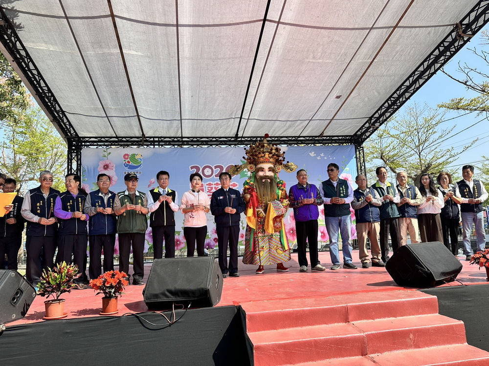 學甲區頭港鎮安宮董事長黃界貞率「軟身福德正神」上台與台南市長黃偉哲、立委陳亭妃、學甲區長張明寶、市議員謝舒凡、陳昆和、蔡蘇秋金、農業局長李芳林、企業家陳連益、市議員參選人王詩媛及各里里長一起祈福為蜀葵花文化節開幕揭開序幕。