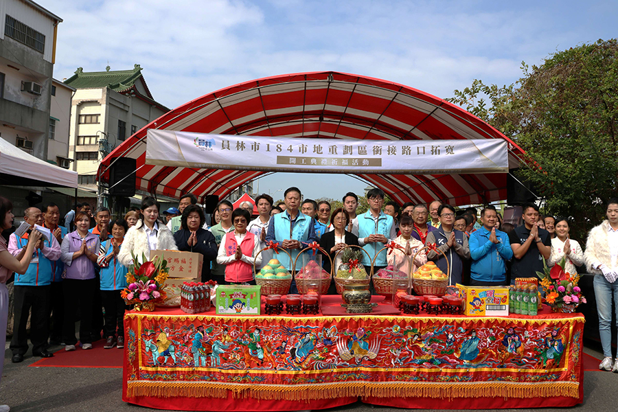 員林市「184公頃市地重劃區銜接路口拓寬開工祈福與會人員有縣長王惠美、代市長賴致富、秘書游筑凱、賴沛然、建設處長陳昌茂、更發科長江家億,議員凃俊任、劉惠娟、張錦昆、曹嘉豪和代表、里長。
