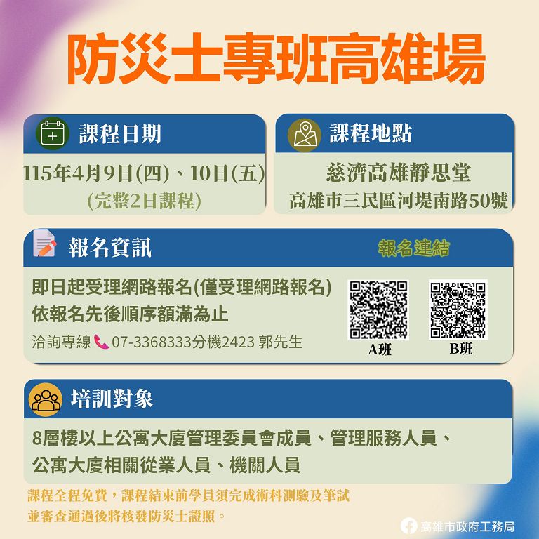 工務局指出,本次A、B兩專班預計各招收正取學員60名,另備取20名,採網路報名方式,依報名時間順序錄取,額滿為止,期盼透過系統化培訓,強化社區第一線防災能量,將防災意識深入生活場域,落實全民防災理念。有意報名或欲了解課程相關資訊的民眾,可撥打07-3368333分機2423,洽郭先生詢問。