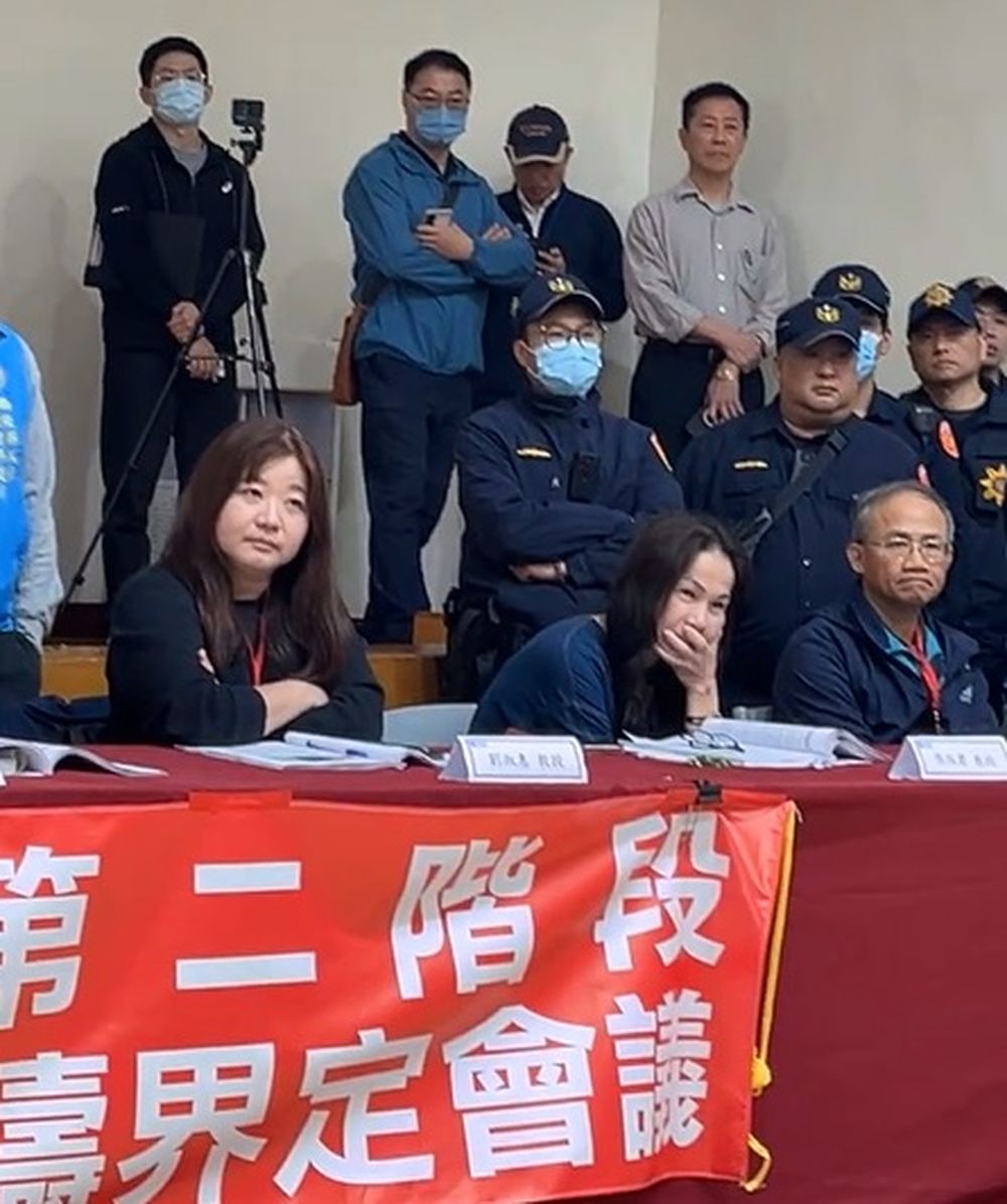 員警說:「我們同仁誰被咬?被咬對不對,逮捕,她咬我們同仁,咬脖子。」涉嫌咬警察的張姓理事長被警方逮捕,場內的火爆對峙,還沒結束,抗議民眾,拿出瓶身印有末日的珍奶,要請評議專家喝,並且不斷朝委員丟生茶葉,就算員警拿體育館內的網子攔截,依然無法阻擋,就連記者的攝影鏡頭,也被激烈推擠不斷晃動。