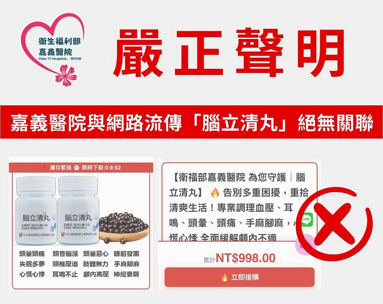 【記者張朝福嘉義報導】網路詐騙手法不斷翻新,甚至出現冒用醫療機構名義誤導民眾的情況。衛生福利部嘉義醫院(以下簡稱嘉義醫院)近日接獲反映,指稱網路出現冒用嘉義醫院名義推銷「腦立清丸」之廣告。嘉義醫院17日發布嚴正聲明澄清:本院從未授權、販售或代言該項產品,該廣告純屬虛假詐騙訊息,請大眾提高警覺。