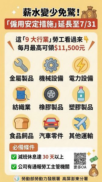 勞動部高屏澎東分署(簡稱高分署)表示,只要是受僱於食品及飼品、紡織、橡膠製品、塑膠製品、金屬製品、機械設備、電力設備及配備、汽車及其零件,以及其他運輸工具及其零件等「九大製造業」的勞工,若與雇主協議減班休息達30天以上並完成通報,每人每月最高可獲新台幣1萬1,500元補貼,最長可領取6個月。