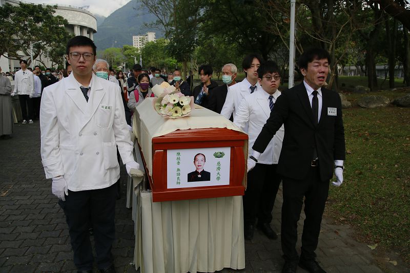 2026年3月慈濟大學醫學生模擬手術課程,20日舉辦送靈、感恩追思暨入龕典禮。一早在靜思精舍常住師父引禮下,慈濟大學師長和醫學系五年級學生、衛福部代訓、澳洲邦德大學和韓國仁荷大學的醫學生一起送別無語良師最後一程。無語良師分別是楊勝焜、陳桂香、蔡許美雪、謝桂林、黃清海、賴韋辰、林振泉。