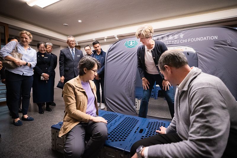 慈濟慈善事業基金會執行長顏博文致歡迎詞,迎賓人員有副執行長張宗義、慈濟大學校長劉怡均、副校長陳宗鷹、主任秘書温蕙甄等慈濟同仁與志工們,以及研發災民安置用品的蔡昇倫博士,展示可折疊、收納的工具,說明研發理念來自證嚴法師對災民的悲心與尊重。