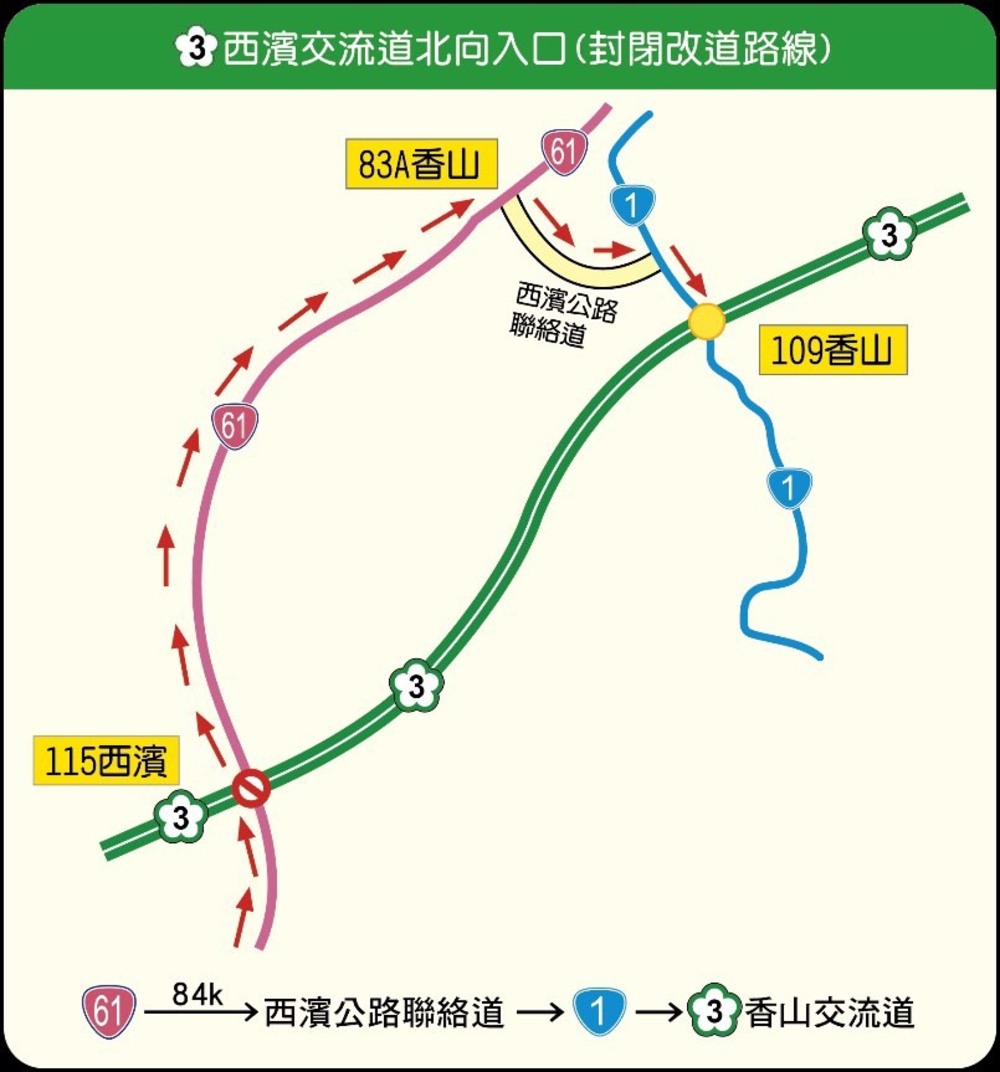 台61線西濱快速道路4月4日至6日中午12時至晚間9時,將封閉冷水坑、復興路、中美里、保福路、苗11線大山腳及竹南垃圾場等6處平交路口,以減少車流交織,提升主線通行效率。