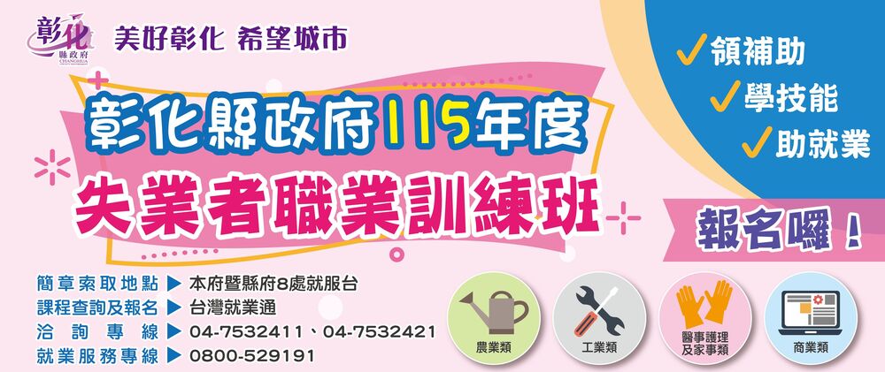 【記者鄭惠珠彰化報導】為協助縣內勞工培養技能、順利就業並取得相關證照,彰化縣政府於115年度規劃辦理22班失業者職業訓練班,包含生成式AI應用、會計與財務應用、美工設計、社群行銷、雲端軟體應用、不動產經紀、觀光導覽、室內裝修與水電維修、空間規劃與收納設計、電腦繪圖與3D列印、CNC程式設計、智慧機電、消防與電信工程、綠能電動機車維修、花藝佈展、農特產加工、智慧農業、坐月子服務、西點烘焙、飲品調製、中餐暨健康餐盒料理、銀髮膳食與樂齡活動設計及寵物美容等多元領域,自即日起開放報名。除專業技能培訓外,亦結合輔導證照及就業媒合,協助學員順利投入職場。