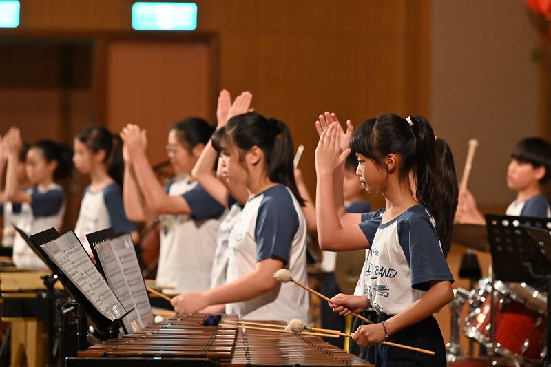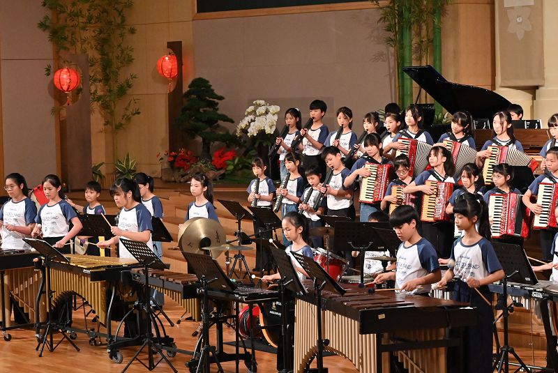 惠文國小兒童樂團為觀眾帶來的音樂饗宴,展現了龐大陣容與藝術實力。樂團由六十位三至六年級學生組成,包含鐵琴、木琴、馬林巴琴、口風琴等多項樂器。演出曲目豐富且多元,從氣勢磅礡的交響樂、節奏明快的打擊樂到動人心弦的抒情樂,並融入兒童舞蹈,將現場氣氛帶動至最高潮,贏得來賓熱烈的掌聲。