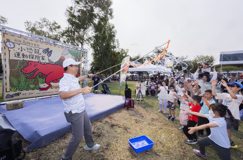 【記者吳峙嵩高雄報導】運動發展局配合兒童節「恐龍酷樂園」活動,於兒童節、清明節4天連假,在衛武營都會公園國泰路側草原,推出「小恐龍運動探險家」活動,首日即湧入逾二千名親子同樂,多元運動體驗及趣味闖關遊戲,打造充滿童趣的恐龍探險主題園區。局長侯尊堯更化身恐龍領隊,帶領小朋友玩轉泡泡,開啟充滿活力與歡笑的運動冒險。
