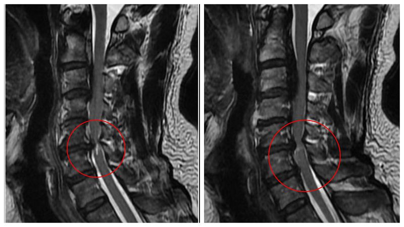 黃先生的頸椎第二節到第六節都有後縱韌帶骨化,其中第五、六節最為嚴重,脊髓已被壓得非常狹窄,核磁共振更可見明顯脊髓空洞,洪祥益主任說,這代表神經已受損,必須盡快手術,若再拖延,一旦跌倒、車禍或頸部突然甩動,都可能造成急性脊髓傷害,增加癱瘓風險。