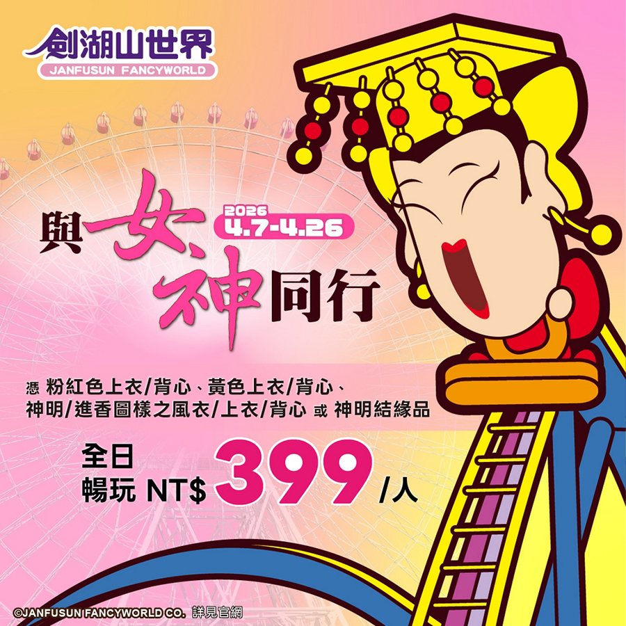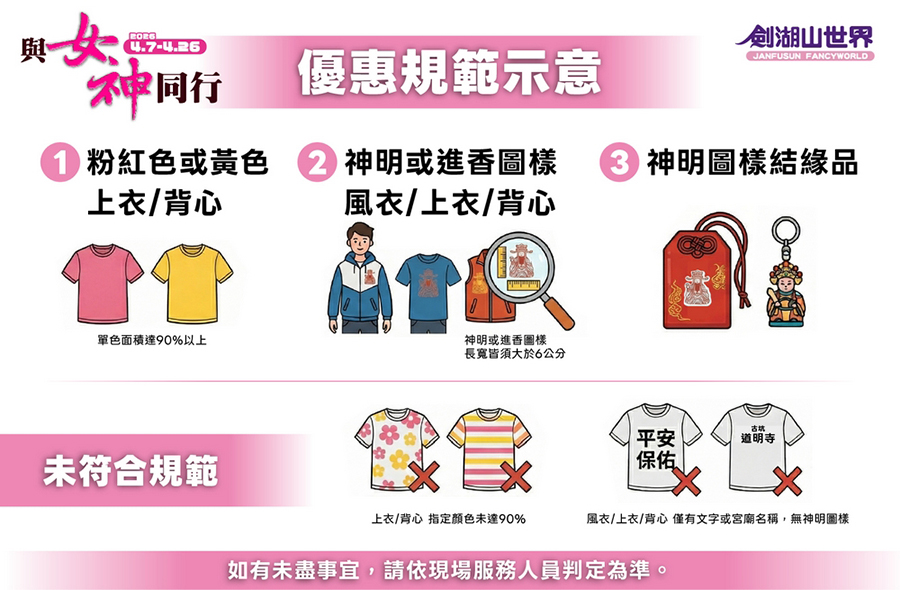 為迎接媽祖進香人潮,劍湖山世界自4月7日至4月26日推出「與女神同行」優惠活動。凡遊客穿著粉紅或黃色上衣、配戴神明圖騰服飾,或出示平安符、令旗等信仰物件,即可享門票399元(原價1199元)優惠,吸引信眾參與。