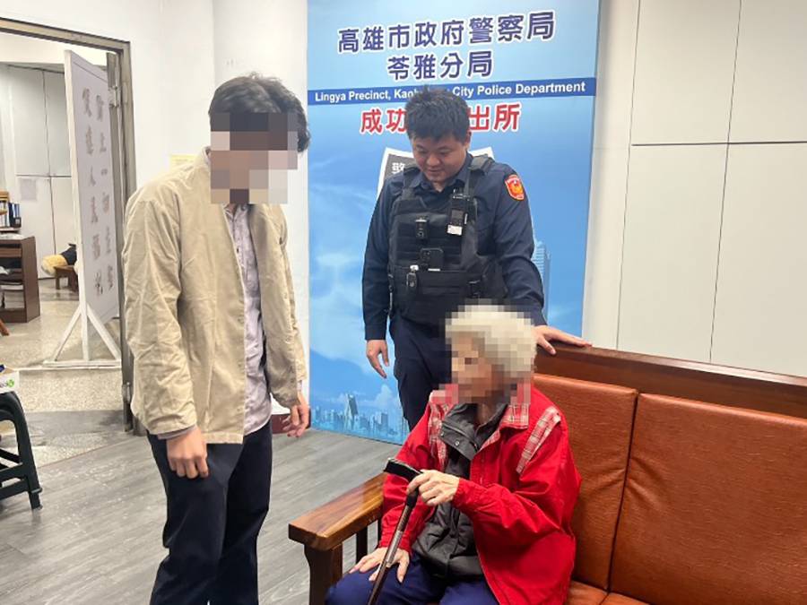 苓雅分局成功路派出所警員劉哲源、孔憲文日前接獲通報,一名高齡婦人在分局門口徘徊,警組立即前往處理。經了解,八旬林姓婦人當時在人行道上來回走動,神情顯露慌張,經警組上前關心詢問,婦人言語含糊,對於住家地址及個人資料無法清楚表達,且身上未攜帶任何可供辨識身分的證件。考量林婦年事已高,且當時天色逐漸變暗,為確保人身安全,員警遂先將婦人帶返派出所休息,並貼心提供溫開水讓婦人稍作歇息,期間員警陪伴婦人聊天,引導回想家人姓名及相關資訊,同時運用系統進行交叉比對查詢,經過一番努力後,終於順利確認婦人身分資料,並成功聯繫上其孫子。婦人孫子接獲通知,第一時間趕抵派出所,他向員警表示,奶奶平日由家人照顧,因記憶退化健忘,當天趁家人不注意時獨自出門,家人發現後正焦急地四處尋找,所幸警方即時發現並細心照顧,才讓奶奶平安無事。【圖文:記者張福全】